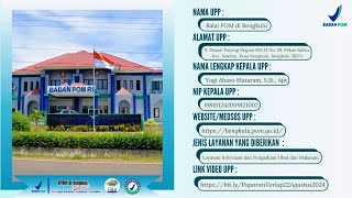 Jingle Keamanan Obat dan Makanan Bersama Duta BPOM di Bengkulu LAYANAN PENGUJIAN BALAI POM DI BENGKULU LAYANAN SERTIFIKASI BALAI POM DI BENGKULU Penyelenggaraan pelayanan publik ramah kelompok rentan Balai POM di Bengkulu Profil Balai POM di Bengkulu Tahun 2022 KINERJA BPOM DALAM 3 TAHUN COVID-19